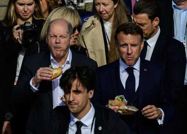 Канцлер Германии Олаф Шольц (слева) и президент Франции Эммануэль Макрон едят бутерброд с рыбой на пирсе в Гамбурге, Германия.